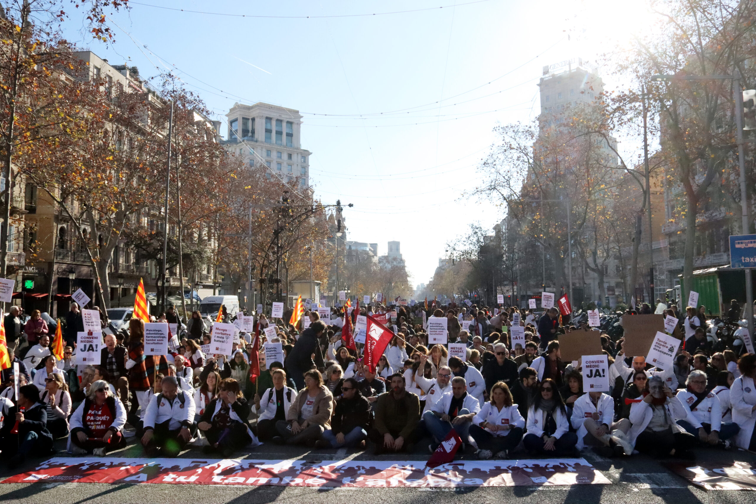 ACN Barcelona – Una nova manifestació de metges ha recorregut el centre de Barcelona en la cinquena jornada de vaga dels facultatius. Sota el lema ‘A tu també t’afecta’, els facultatius han tornat als carrers per reclamar millores laborals i un conveni propi que tingui en compte les seves especificitats. També han reclamat la dimissió de la consellera de Salut, Olga Pané, a qui acusen de no tenir “cap interès de resoldre el conflicte”. El Departament de Salut ha situat en el 7,3% el seguiment de la vaga convocada per Metges de Catalunya i el Sindicat de Metges i Metgesses d’Atenció Primària als centres del SISCAT, mentre Metges de Catalunya l’eleva fins al 53%.