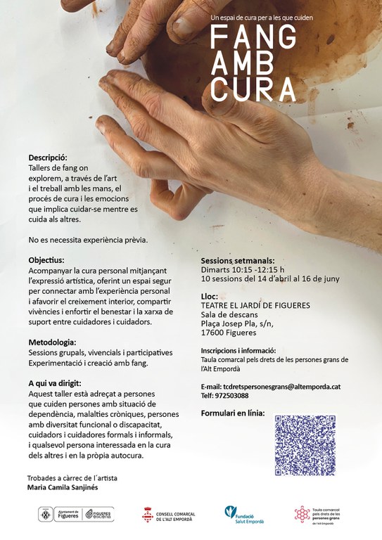 L’Ajuntament de Figueres, com a part d’una iniciativa conjunta amb el Consell Comarcal de l’Alt Empordà i la Taula comarcal pels drets de les persones grans, ha posat en marxa un taller anomenat Fang amb cura. Aquesta activitat, que es desenvoluparà entre abril i juny del 2026, pretén ser un espai de trobada i suport emocional per a persones que exerceixen el rol de cuidadores. A través de tècniques artístiques i manualitats, els participants podran explorar les seves emocions i el procés de cura, tant propi com dels altres.